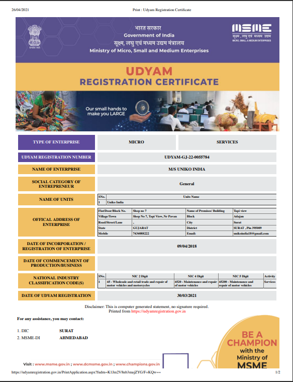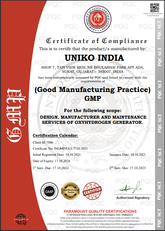 Uniko India Incorporated, established on April 9, 2018, is a dynamic startup based in Surat, Gujarat. We specialize in the manufacturing, supplying, and exporting of cutting-edge HHO generators, catering to a variety of industries including automotive, boiler, cutting, and welding. Our flagship product, the Uniko Carbon Cleaner, has gained significant recognition within the automotive industry for its exceptional ability to decarbonize vehicle engines, contributing to improved performance and reduced emissions. Backed by our robust quality standards and a range of certifications including GMP, ISO9001-2015, CE, Startup India, SGCCI, and MSME, we pride ourselves on delivering products that consistently achieve remarkable results.